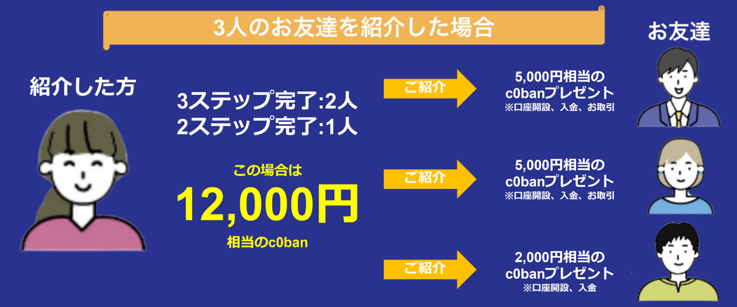 お友達を紹介いただくと、お客さま(紹介した人)とお友達(紹介された方)の双方にc0banをプレゼントいたします。さらにお友達(紹介された方)が入金、お取引をすると追加で双方にc0banをプレゼントいたします。