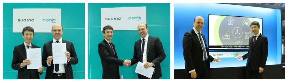 調印式では、CENIT AGの CEO、Peter Schneck氏とスギノマシン副社長の杉野岳が握手を交わし、今後の協業体制への期待や、ロボットをはじめとする自動化ソリューションに関する意気込みを語り合いました。