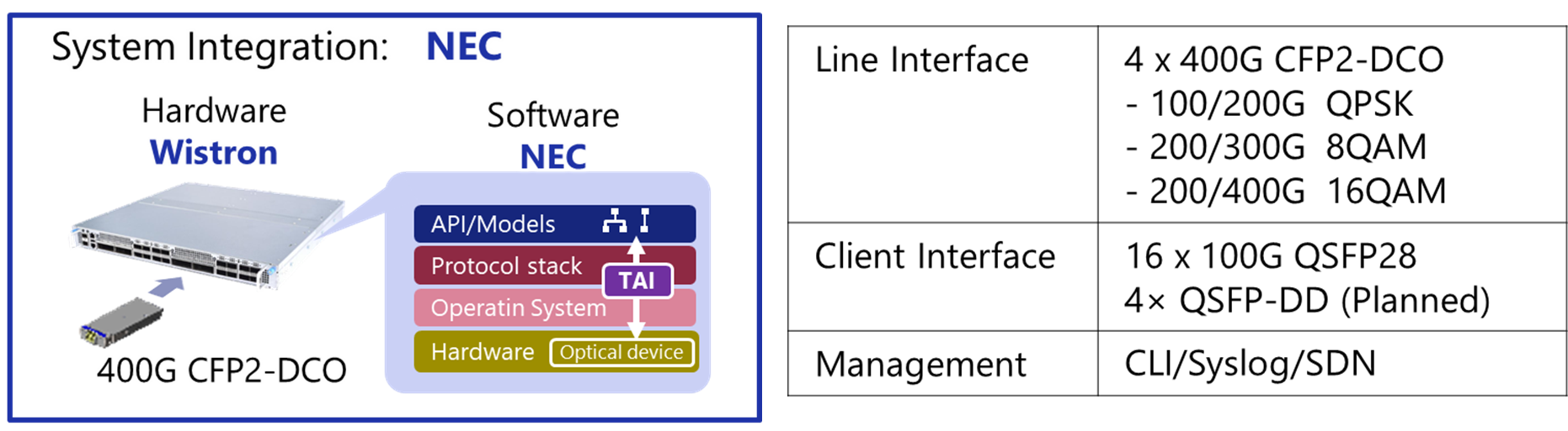 NECのオープン400Gトランスポンダは、ハードウェアとソフトウェアを分離したアーキテクチュアを採用しており、オープン市場に供給されるホワイトボックスのハードウェア上に、NECがオープンソースソフトウェアをベースに開発したNetwork Operating System(NOS)ソフトウェアを搭載しています。本製品には、OpenROADMやOIFなどで標準化された400GのCFP2-DCOを組み合わせることが可能で、NECはこれらを活用したシステム全体をインテグレーションする役割を担っています。