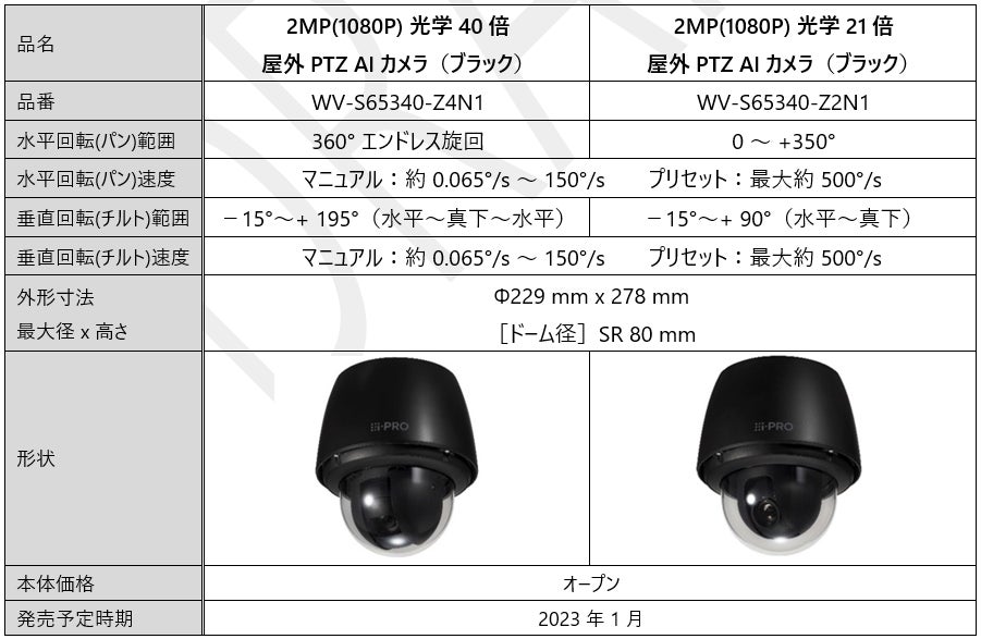 今回追加するPTZカメラは、パン・チルト・ズーム動作の高速化と耐久性強化、AI自動追尾の標準搭載など、本年加わったSシリーズPTZカメラの基本性能はそのままに、黒やこげ茶といった濃色の壁にも景観を損ねずに設置できるブラックモデルと、重塩害地域にも設置可能なモデルの追加を行ったものです。