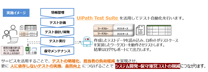 テスト自動化のノウハウがないお客様も、本サービスによりテストの計画・設計・開発・実行のサポートを得ることで、よりスムーズにTest Suiteを活用し、保守運用コストを大幅に削減いただけることと思います。