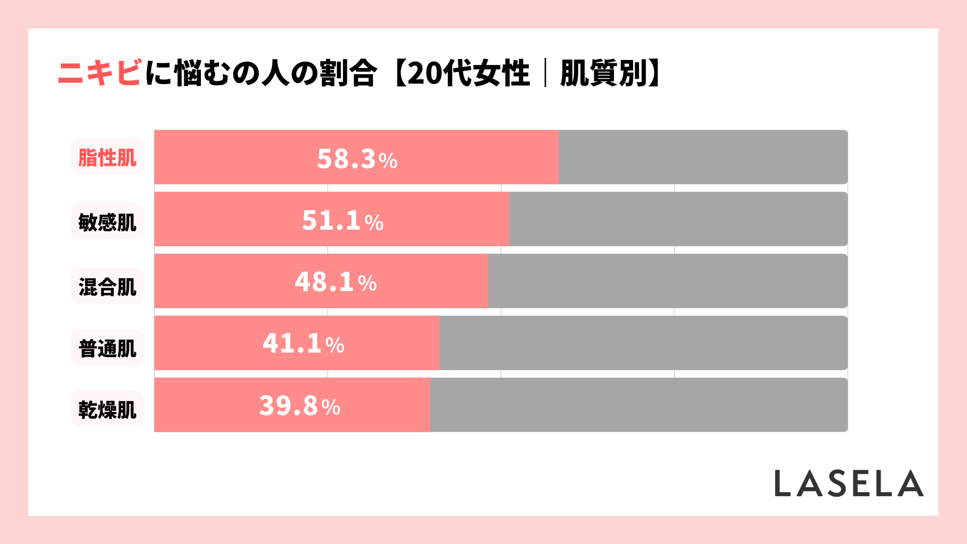 - ニキビに悩む人の肌質は脂性肌(58.3%)が最多、続いて敏感肌(51.1%)