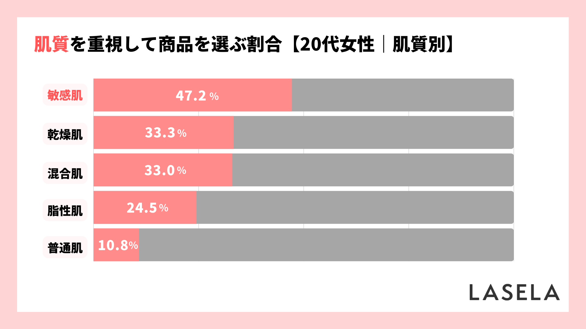 「肌質」と回答した人の割合を肌質別で見ると、「敏感肌」が47.2%で最も多く、普通肌と5倍近い差がありました。