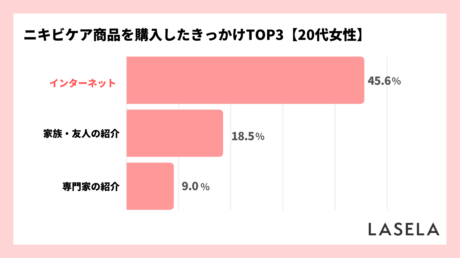 ニキビの悩みを抱える476人のニキビケア商品を購入したきっかけを調べた結果、TOP3は「インターネット」が45.6%、「家族・友人の紹介」が18.5%、「専門家の紹介」が9.0%でした。
