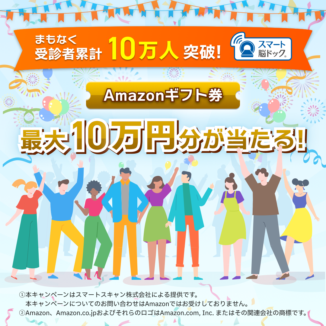 今回はTwitterでキャンペーンを開催し、【10万件達成時点】で、「スマート脳ドック」のアカウントをフォローしキャンペーン投稿をリツイートしている方を対象に、抽選でAmazonギフト券10万円分や「スマート脳ドック」ギフトチケットをプレゼントいたします。