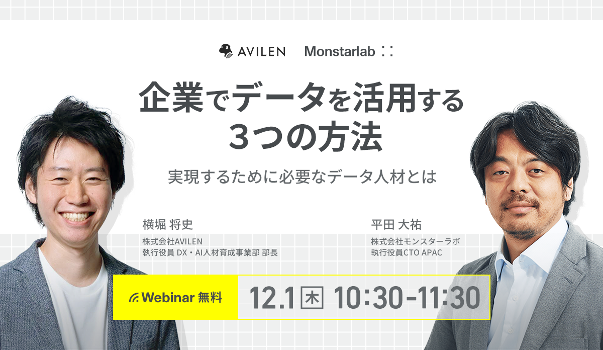 本セミナーでは「最新のテクノロジーを、多くの人へ」というビジョンのもと、AI人材育成ソリューションを提供する株式会社AVILENと、世界各国でデジタルコンサルティング事業を展開し企業のDX推進をサポートしている株式会社モンスターラボが、「データ利活用の3つの方法」、「データ利活用における課題」「データ利活用を実現するために必要なデータ人材」といったデータ利活用のポイントをご紹介いたします。