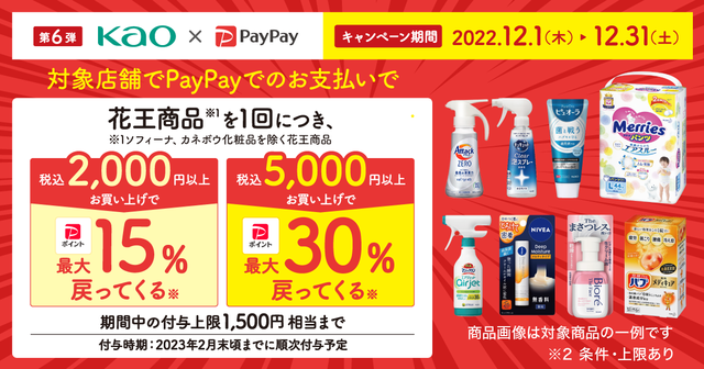 PayPay株式会社(以下、PayPay)とヤフー株式会社(以下、Yahoo! JAPAN)は、対象店舗で花王株式会社(以下、花王)の商品を、キャッシュレス決済サービス「PayPay」で購入したユーザーに、花王商品のお買い上げ金額の最大30%分をPayPayポイント(※1)で付与する「花王商品の購入で最大30%戻ってくるキャンペーン」(以下、本キャンペーン)を2022年12月1日(木)から12月31日(土)まで実施します。