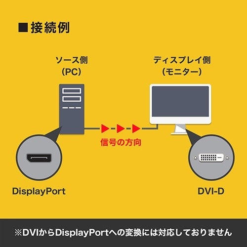 DisplayPort端子を搭載したパソコンから、DVI端子を搭載したディスプレイモニターなどへ映像出力が行えます。プラグアンドプレイで簡単に信号の変換が可能です。