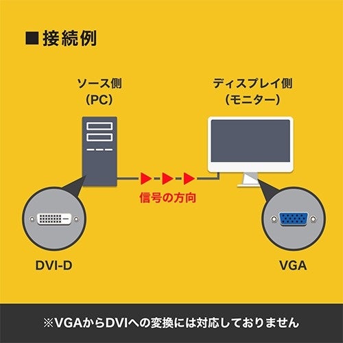 DVI端子を搭載したパソコンから、VGA端子を搭載したディスプレイモニターなどへ映像出力が行えます。