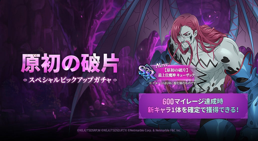 この原初の破片スペシャルピックアップガチャからは他にも、【「大海」の降臨】光の盟約 タルミエル、【「竜巻」の降臨】光の盟約 サリエル、【ラグナロク】荒くれ者 バン等のキャラもラインナップしております。さらに、ガチャの回数に応じて貯まるマイレージ報酬では、600マイレージ到達で新SSR【原初の破片】最上位魔神 キューザックを入手することができます。この機会にぜひ手に入れてください。