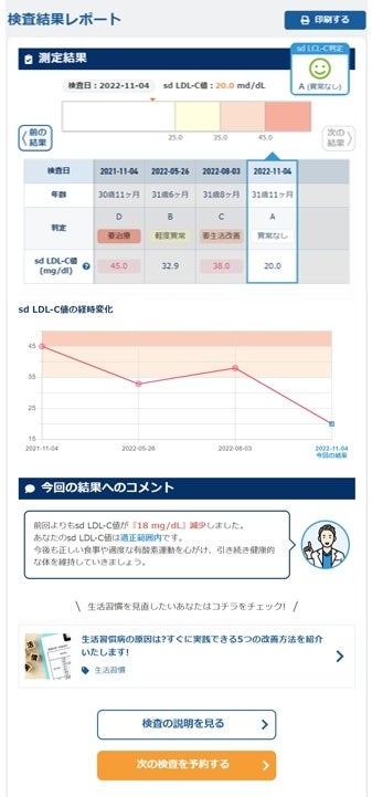 ・過去に受診した結果(直近、最大5件分)の比較が可能となり、生活改善の状況をチェックすることができます。