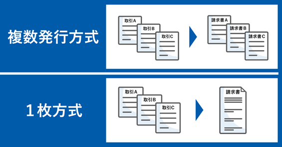 | 複数発行方式 | ・1取引ごとに税計算を行った金額を記載した適格請求書を発行するものです。 ・「GMO掛け払い」による取引が同じ取引先から複数ある場合、取引数に対応した数の適格請求書を発行します。 ・取引ごとに税計算を行い端数処理をするため、取引時点での提示金額と最終的な請求金額に差異(※2)が発生しません。・適格請求書発行時に発行枚数に応じた費用が発生するため、同じ取引先との取引が少ない事業者に適しています。 |