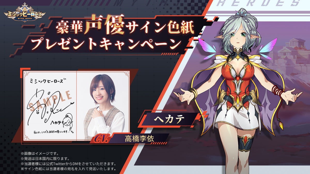 スマートフォン向けゲームアプリのグローバルメーカーIGG(グループCEO: Zongjian Cai 香港証券取引所上場 日本所在地:東京都新宿区)は、放置系神話RPG『ミシックヒーローズ』の公式Twitterにて、抽選で「ヘカテ役:高橋李依さん」のサインが当たる『第4弾 豪華声優サイン色紙プレゼントキャンペーン』を開催いたします。