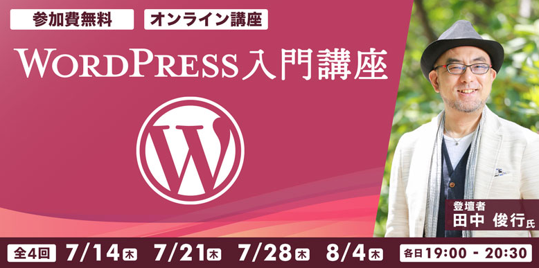 なお、6/23(木)には、オンラインセミナー「WordPress入門」も予定しております。講師の田中氏が登壇いたしますので、講座への参加をご検討中の方は、こちらにもぜひお申し込みください。