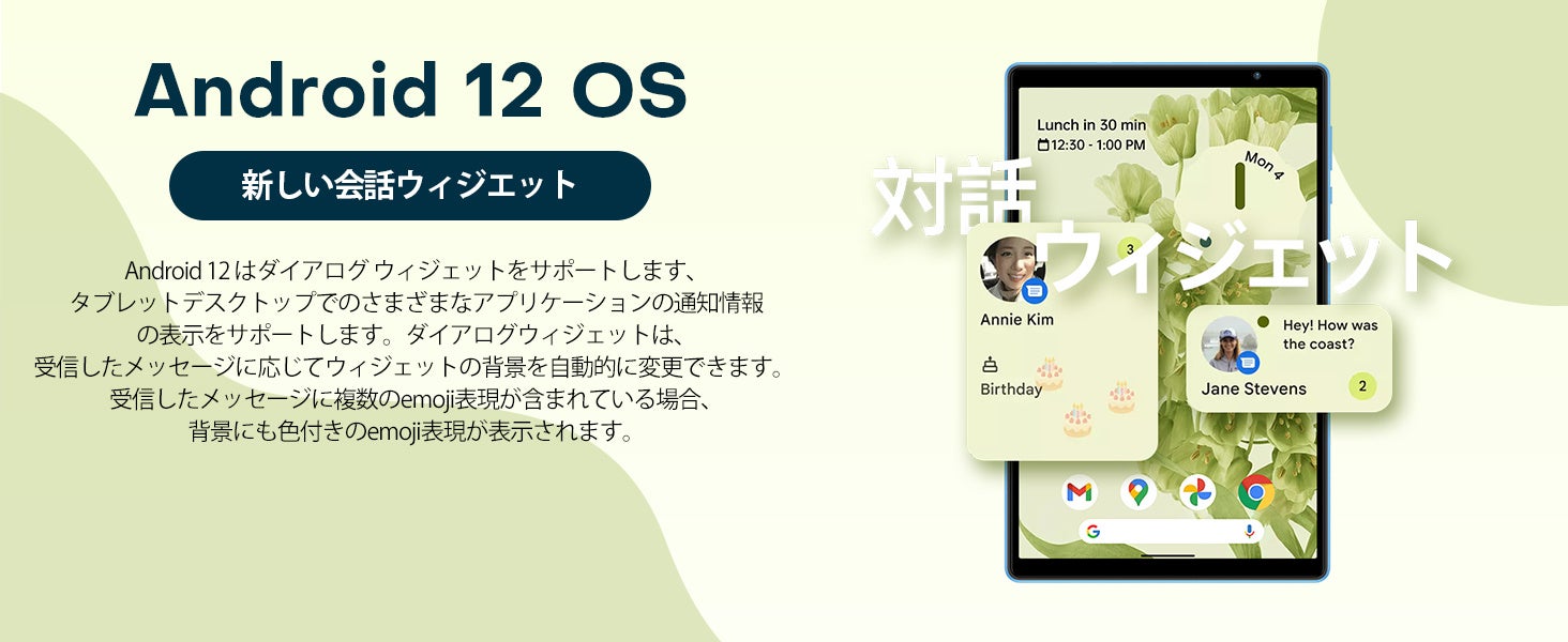 Android 12は、よりパーソナルで安全、かつ簡単なユーザー体験を提供します。 直感的なUIデザインと最適化されたシステムロジックにより、タブレットの動作がこれまで以上にスムーズになります。ユーザー情報セキュリティを考慮して設計されていますので、Android 12は、強力で使いやすいプライバシー機能を提供します。 誰がいつあなたのデータを見ることができるかを制御できるので、安心して使用できます。