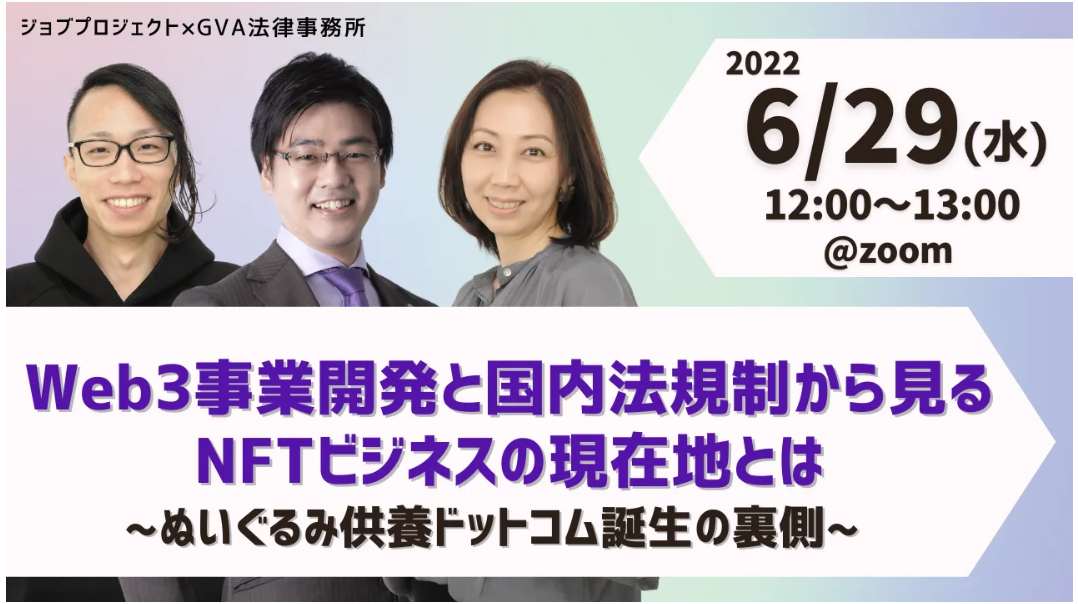 本セミナーでは、ジョブプロジェクト株式会社の顧問弁護士であるGVA法律事務所の熊谷弁護士とともに、ジョブプロジェクトが立ち上げたNFT事業である最新デジタル供養サービス「ぬいぐるみ供養ドットコム https://nuigurumikuyo.com 」誕生の裏側にどのような日本の法規制に対する配慮があったのかという事例を紹介しながら、日本国内法の中でNFTをはじめとしたWeb3事業開発にどのような可能性があるのか、またどのようなポイントを確認するべきなのか、ということについてディスカッションベースですすめるセミナーとなっております。