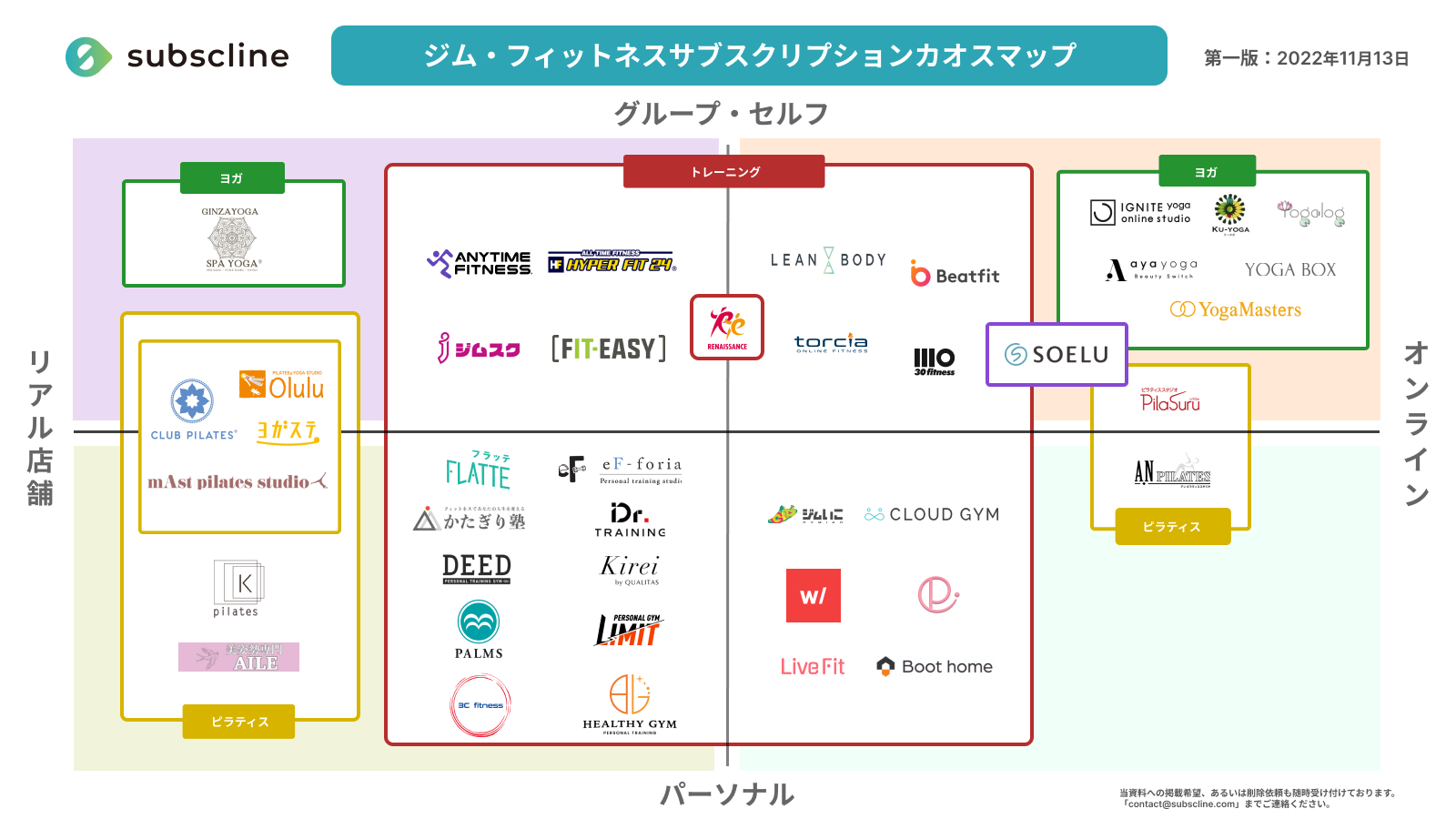 グループ・セルフ — パーソナル、リアル店舗 — オンライン の2つの軸と、トレーニングやヨガなどの専門ジャンルを含むカテゴリー分類によるマッピングを行いました。