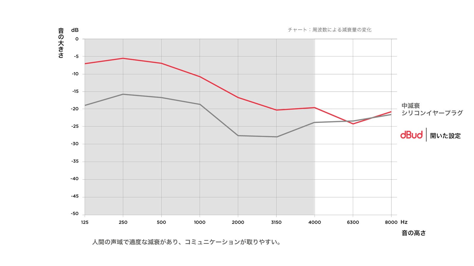 アコースティックフィルターは、減衰カーブを変化させます。一般的な人間の会話の周波数をより少なく、他の周波数をより多く減衰させるように設計されています。つまり、周囲の雑音を抑えながら、周囲の人の声を聞き取り、コミュニケーションをとることができます。