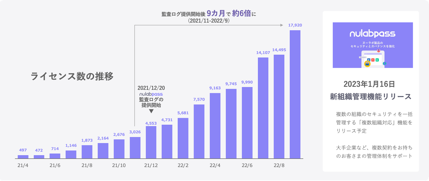 2021年12月からは「監査ログ」の提供を開始し、同機能提供開始後の9ヶ月間で、Nulab Passのユーザー数は約6倍に成長しています。