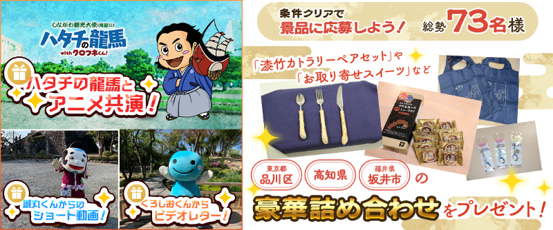 このイベントは、品川区がそれぞれ連携協定を結ぶ高知県と福井県坂井市に呼びかけ、制作した観光PR動画「ハタチの龍馬つながり旅 with くろしおくん・城丸くん」の視聴や、各自治体のスポットに設置されたキャラクターパネルの二次元コードを読み込むことで参加できるもので、各自治体のキャラクターがARで現れるなど参加者を楽しませてくれたり、各自治体からの選りすぐりのプレゼントが抽選で当たる企画です(イベント参加にはスマートフォン、プレゼント応募にはTwitterもしくはInstagramのアカウントが必要)。