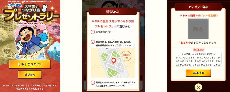 各自治体に設置されたスポットを訪れ、チェックポイントでQR コードを読み込むか、動画内に登場するキーワードを入力すると、各自治体が用意した豪華プレゼントの抽選に応募できるようになります。