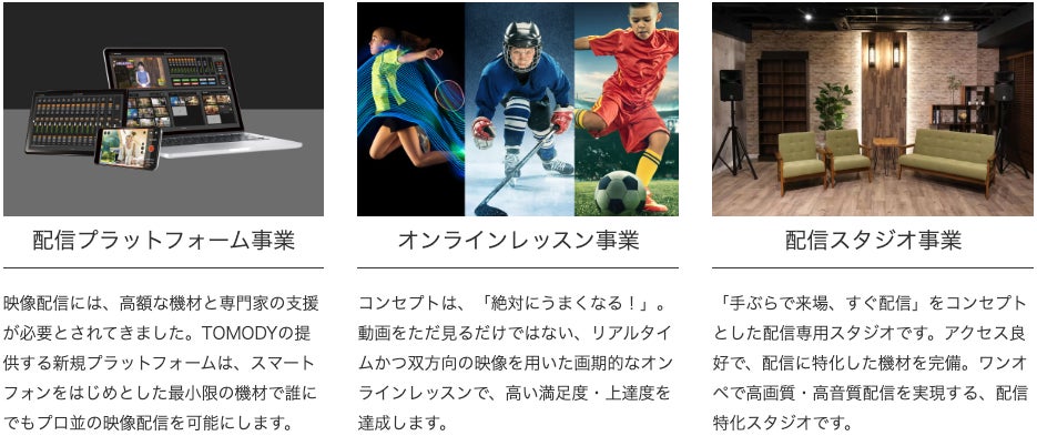 TOMODYは経営理念の「あらゆる体験をもっと身近に」を実現すべく世の中のニーズに適した「オンライン配信」を行うためのプラットフォームを提供致します。配信やオンラインレッスンに特化した配信プラットフォームを基盤として活用し、配信専用のスタジオの運営やオンラインレッスンの事業展開も行っております。