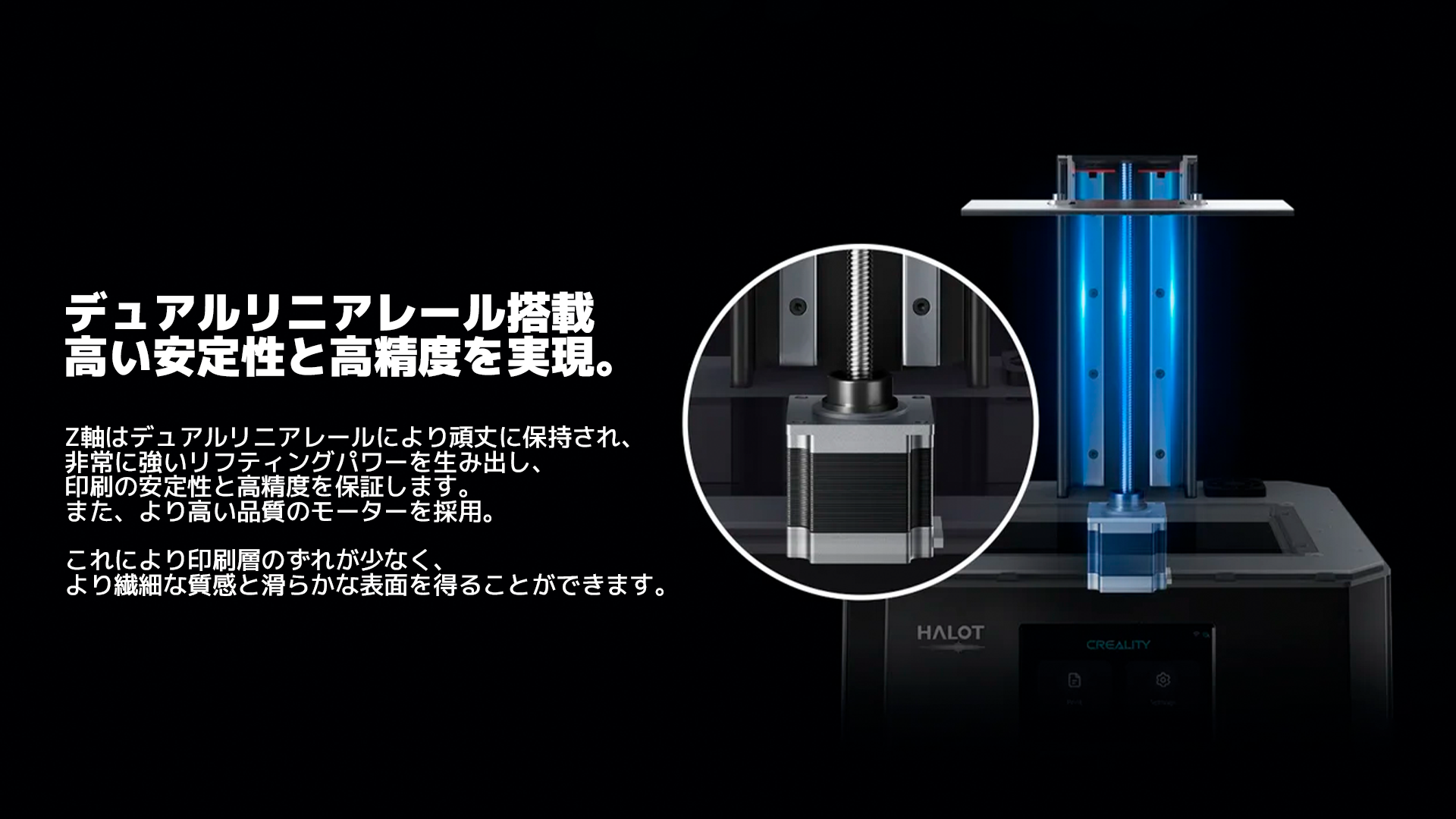 Mars 3 Proがシングルリニアレールなのに対し、HALOT ONE-PLUSがデュアルリニアレールなのも造形の安定性が高くなります。