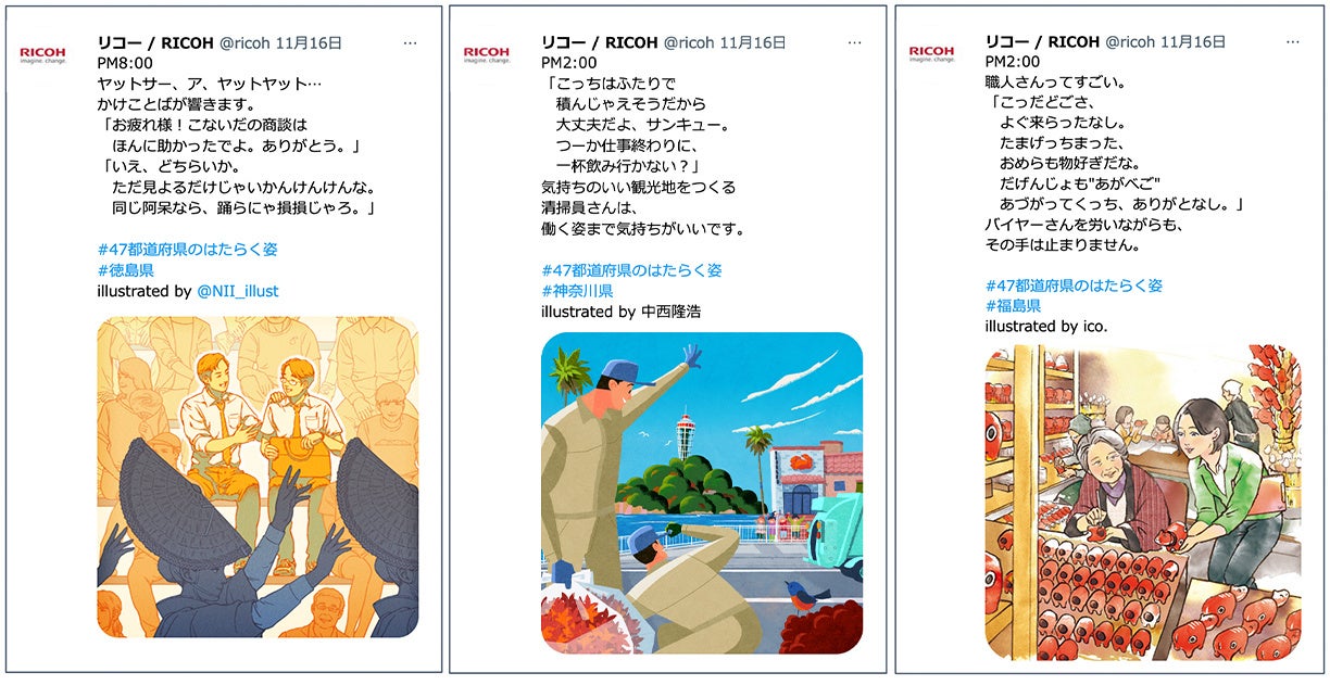 47都道府県・47人のイラストレーターが描く“はたらく”のシーンとともに「ありがとう」を伝えるツイートを、公式Twitterにて11月15日(火)から17日(木)までオーガニック投稿します。それらの47投稿をモーメント化して11月18日(金)から発信します。