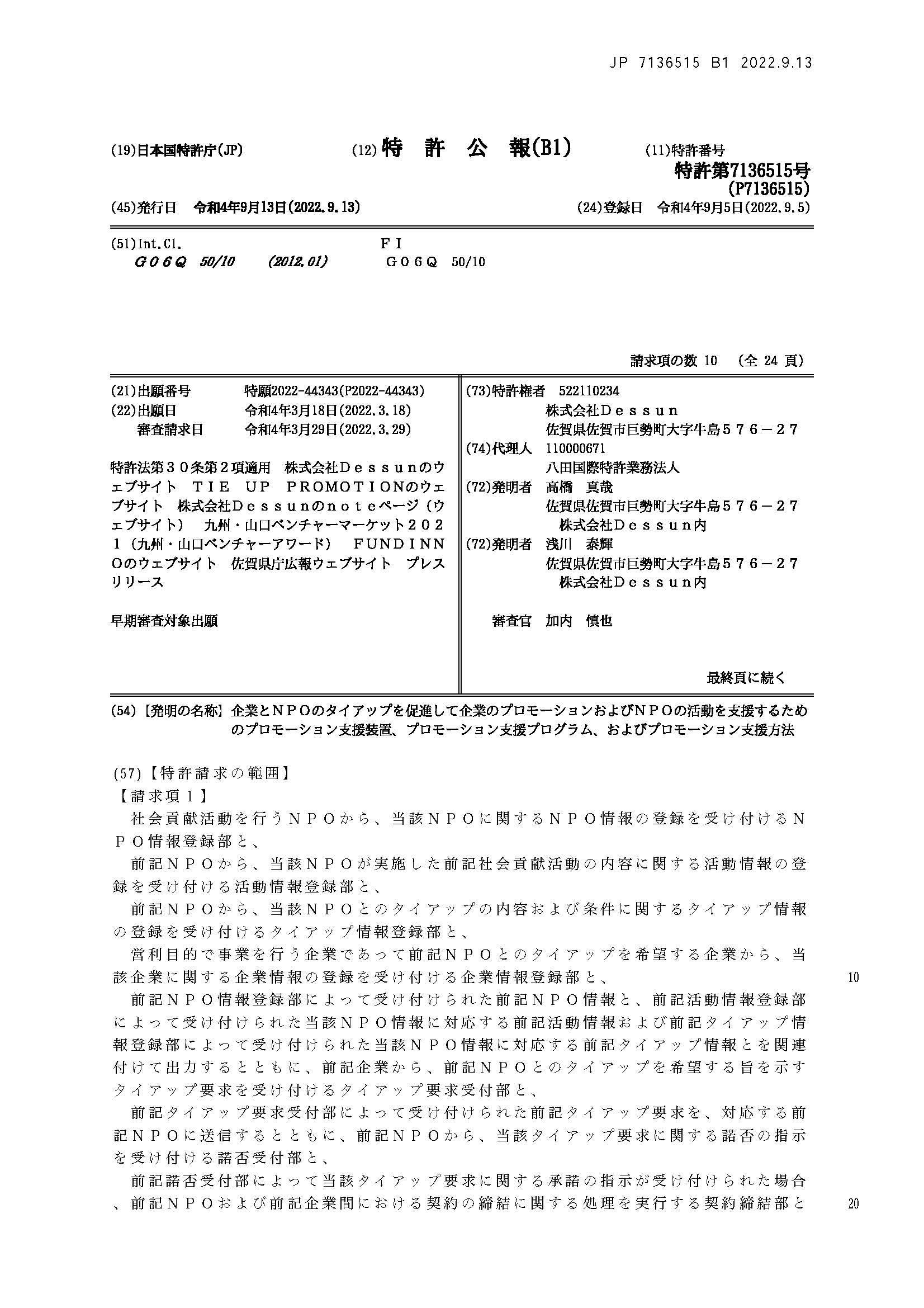 株式会社Dessun(Dessun Inc)は、”企業”と”NPO法人”のマッチングプラットフォーム「TIE UP PROMOTION」(https://tie-up.promo)にて特許の取得したことをお知らせします。