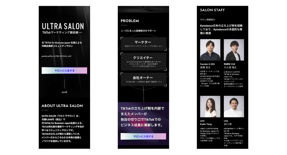ULTRA SALON(ウルトラサロン)は、月額9,800円(税込)でTikTok for Business Japan出身による、TikTok特化型の最新マーケティング手法が学べるコミュニティサロンです。TikTokの立ち上げ期から運営していたメンバーだからこそわかる本物の経験とノウハウを提供し、本サービスならではの独自の切り口でTikTokでのビジネス成長に貢献します。