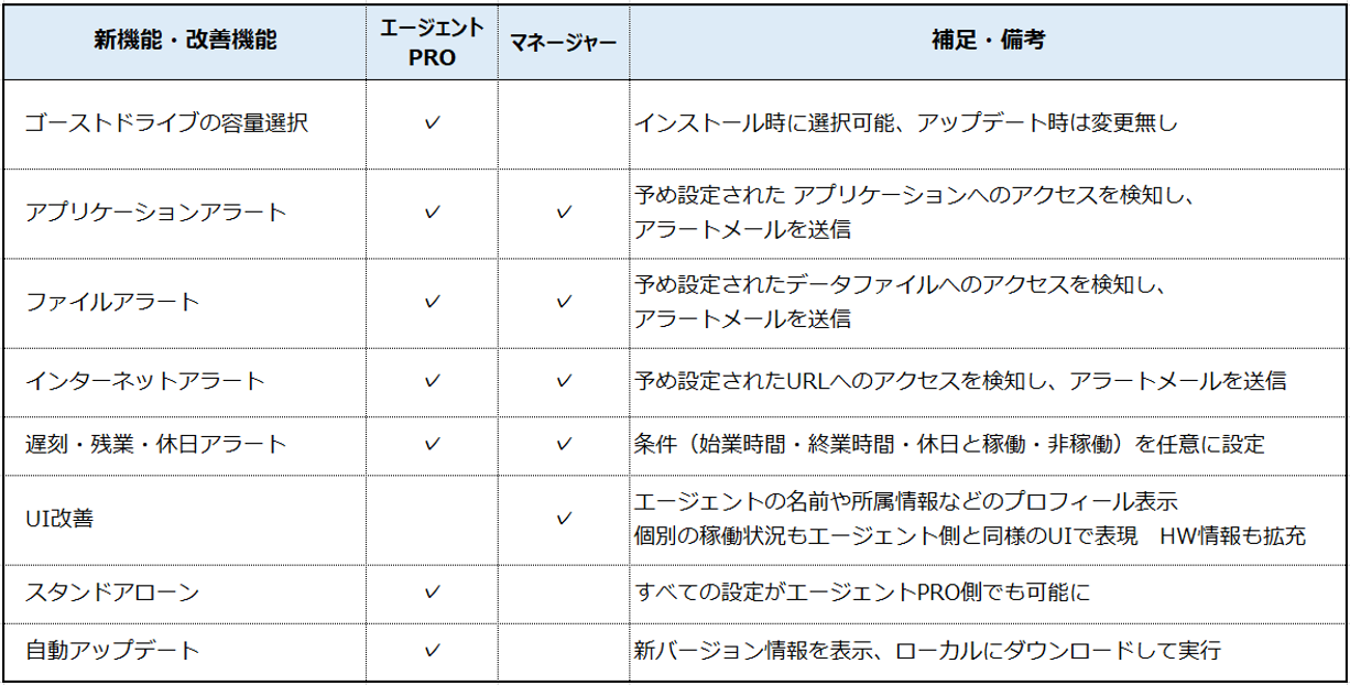 新バージョンのJasmy Secure PCでは、お客さまの声を取り入れ、独自のブロックチェーン技術を活用した3つの特徴である“ドライブレコーダー機能”、“ゴーストドライブ機能”、“リモートハンドリング機能”の機能強化を行いました。また、管理ソリューションのJasmy Secure PCマネージャーを利用しないお客さま向けに、Jasmy Secure PCエージェントPRO単独での利用に対して、使い勝手を向上いたしました。