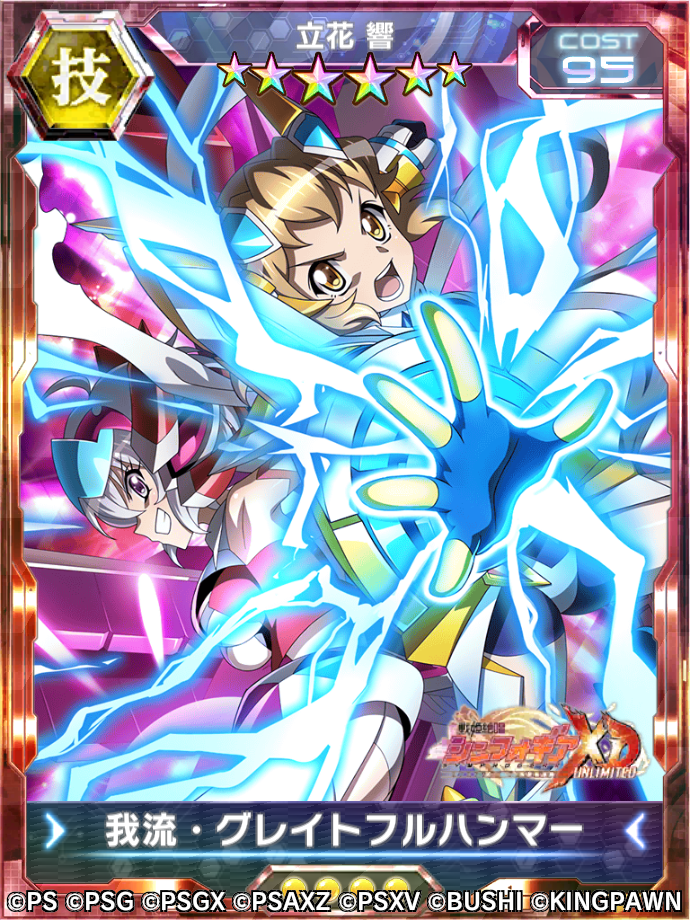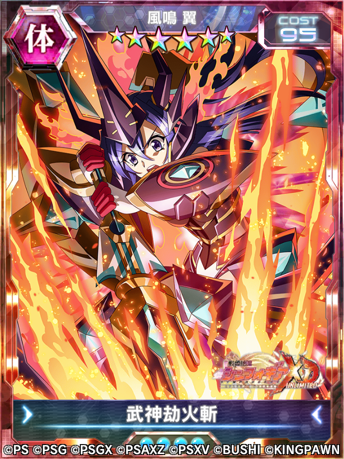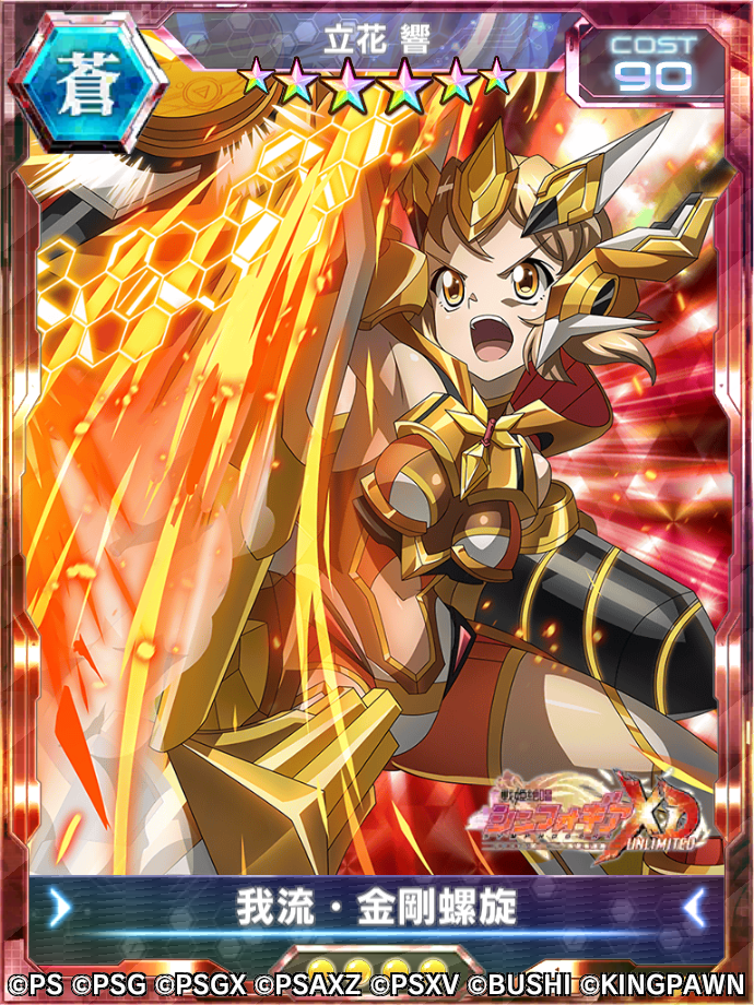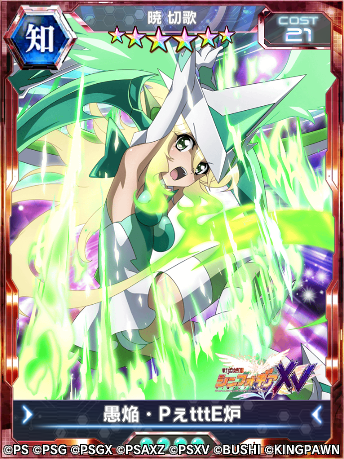 「11回ガチャ」1回目では、ギア形状が「バーニング・エクスドライブ」か「アマルガム」である特定の★5シンフォギアカードが、上限解放後の★6の状態で排出。