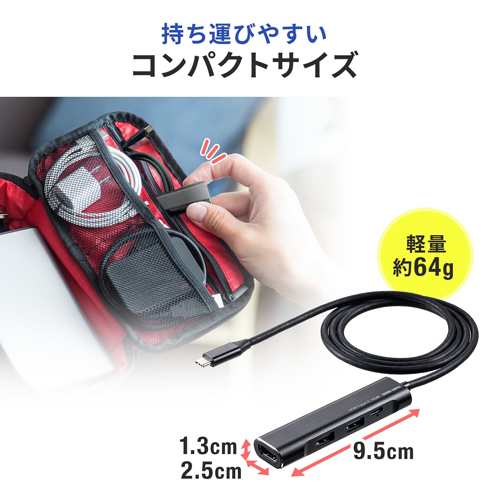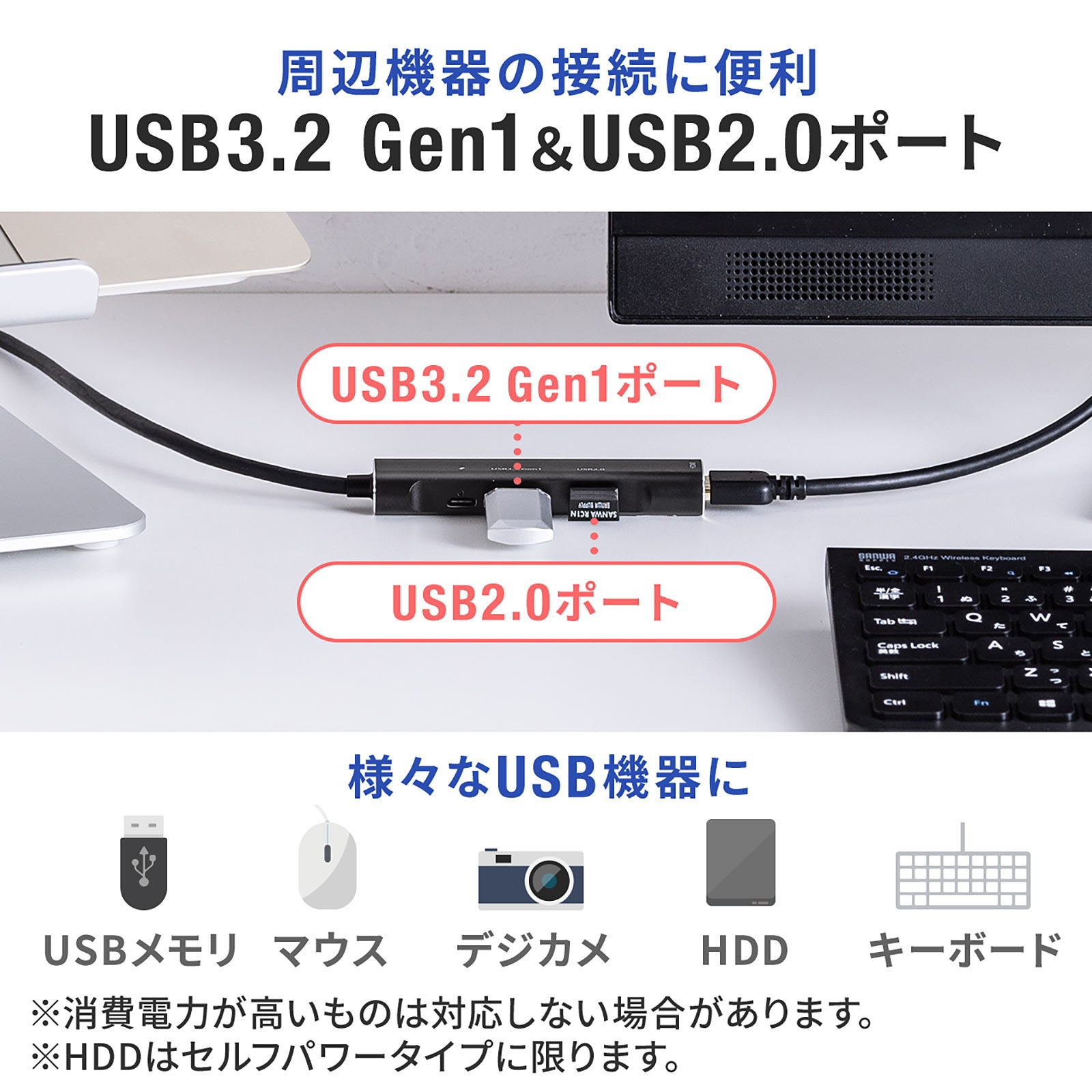 本製品は、USB Type-Cポート1ポートをUSB3.2 Gen1(USB3.1 Gen1/USB 3.0)×1、USB2.0×1、USB PD対応Type-C×1、HDMI出力×1に増設できる、USB Type-Cハブです。