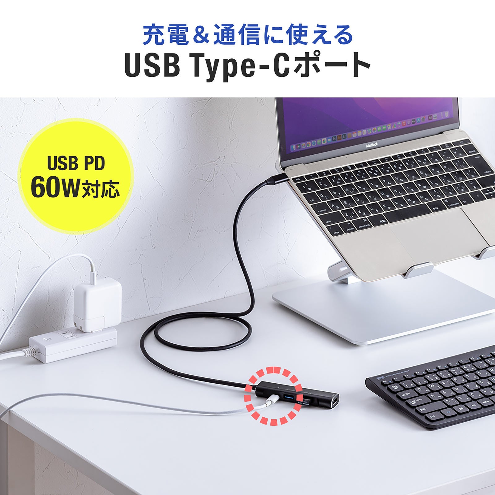 Type-CポートはUSB PD(USB PowerDelivery)対応で、最大60WまでのUSB PD対応機器の充電に対応しています。Type-CポートにはマウスやUSBメモリーが接続可能で、パソコンの純正ACアダプターを接続すれば周辺機器を使用しながらUSB PD対応のパソコンの充電ができます。