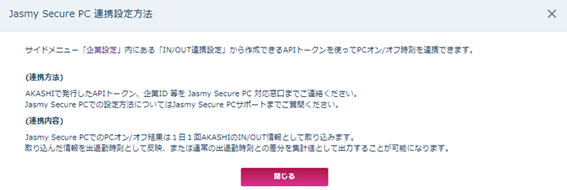 今回のAPI連携によって、「Jasmy Secure PC」がインストールされたパソコンにて、ログイン/ログオフした時刻情報を「AKASHI」の出退勤情報として自動登録、または通常の出退勤時刻との差分を集計値として出力することが可能になります。