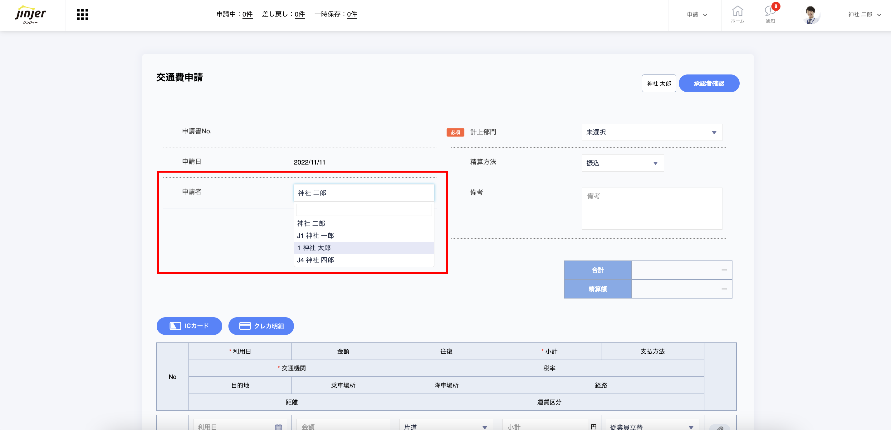 ▶代理申請者は、ジンジャー経費の申請画面上で本来の申請者を選択します。