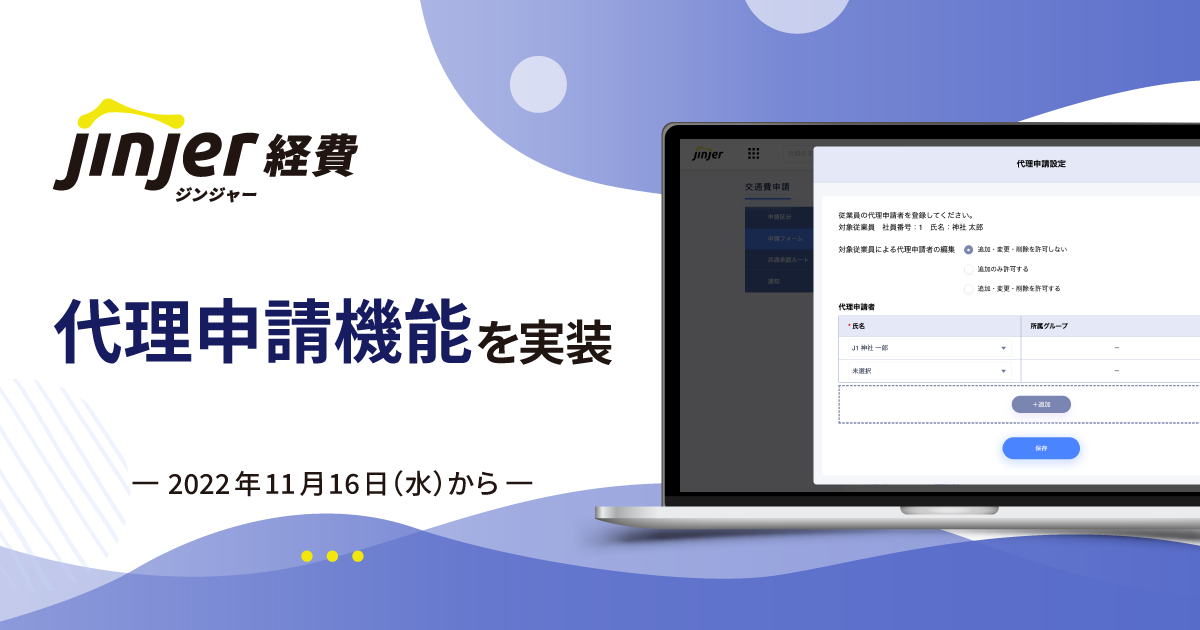 バックオフィス向けクラウドサービス「ジンジャー経費」を提供するjinjer株式会社(本社:東京都新宿区、代表取締役CEO:加藤 賢)は、経費精算時における代理申請機能を2022年11月16日(水)から実装することをお知らせいたします。