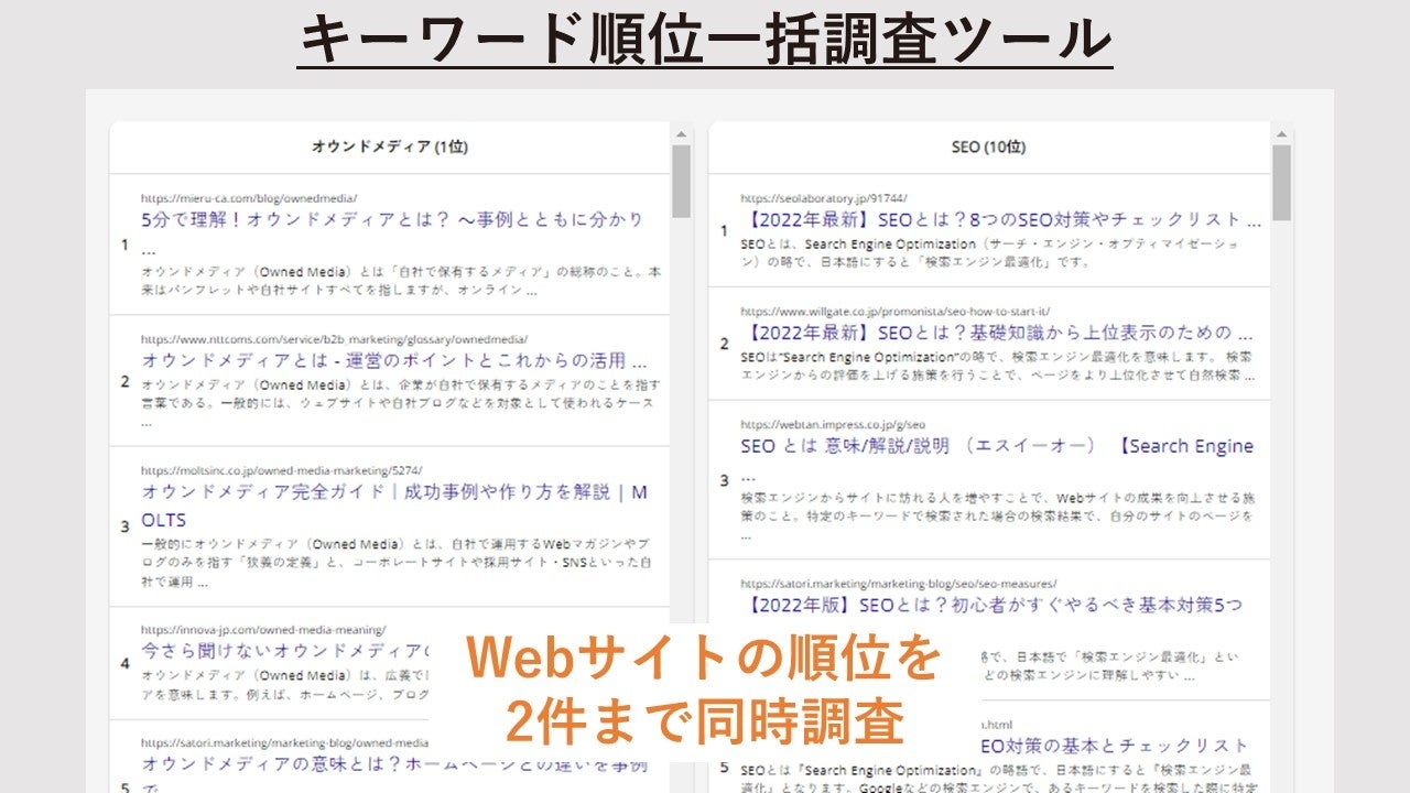 そして「キーワード順位一括調査ツール」では、 Google 検索結果における Web サイトの順位を一括で 2 件まで同時に調査でき、自社サイトの健康状態のモニタリングに最適です。