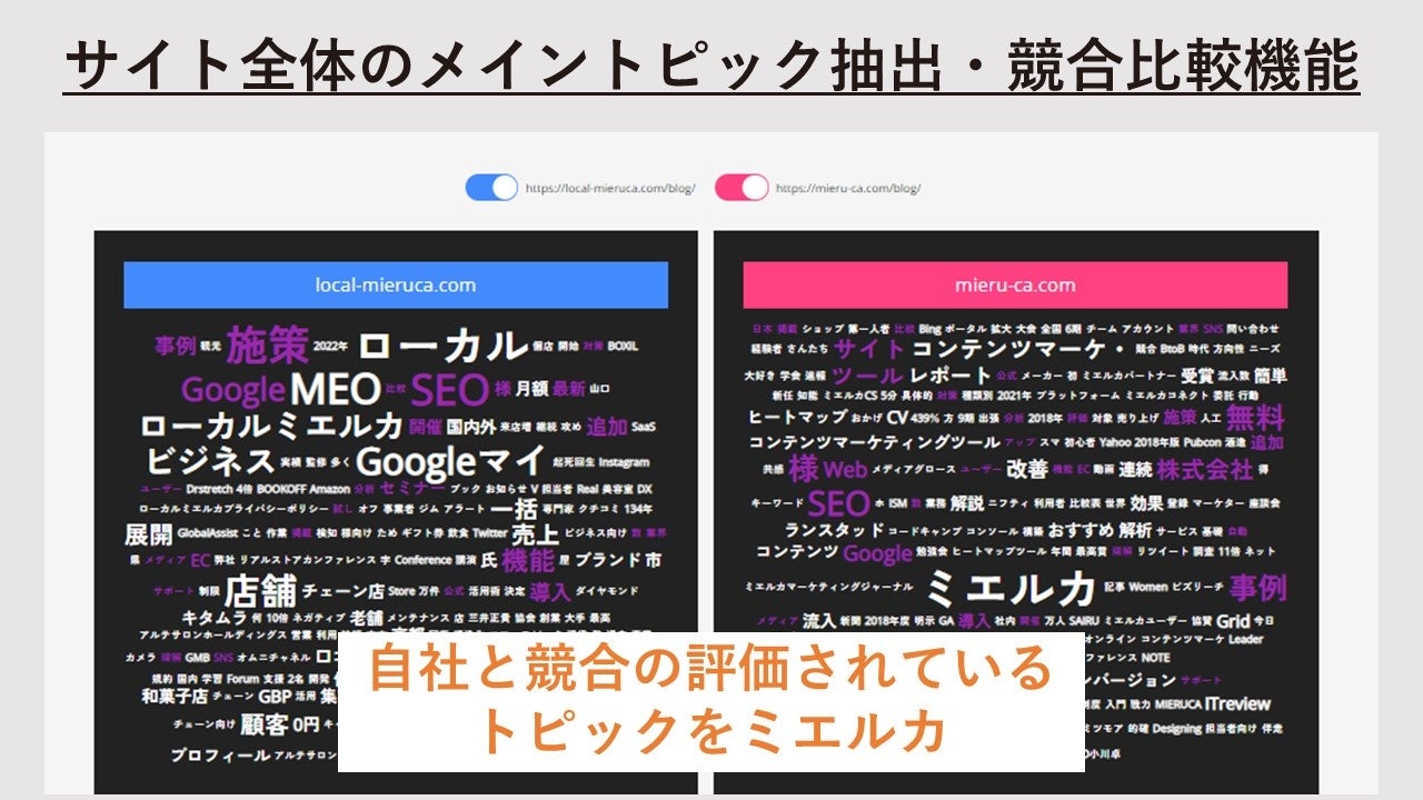 また、「メイントピック抽出ツール・競合比較ツール」では、自社及び競合のドメインから、評価されている50ページを抽出し、解析。サイト全体で評価されている主要なトピックを理解することで、自社に足りないメイントピックを可視化することができます。