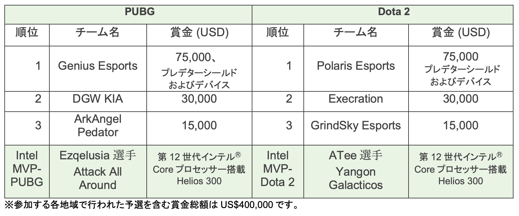 本大会の採用ゲームタイトルは、PUBG: BATTLEGROUNDS (PUBG)およびDota 2です。参加する各地域で行われた予選を含む賞金総額はUS$400,000。日本で行われたグランドファイナル優勝チームには、下記賞金の他にUS$10,000相当のPredatorブランド等のゲーミングデバイスが贈呈されました。