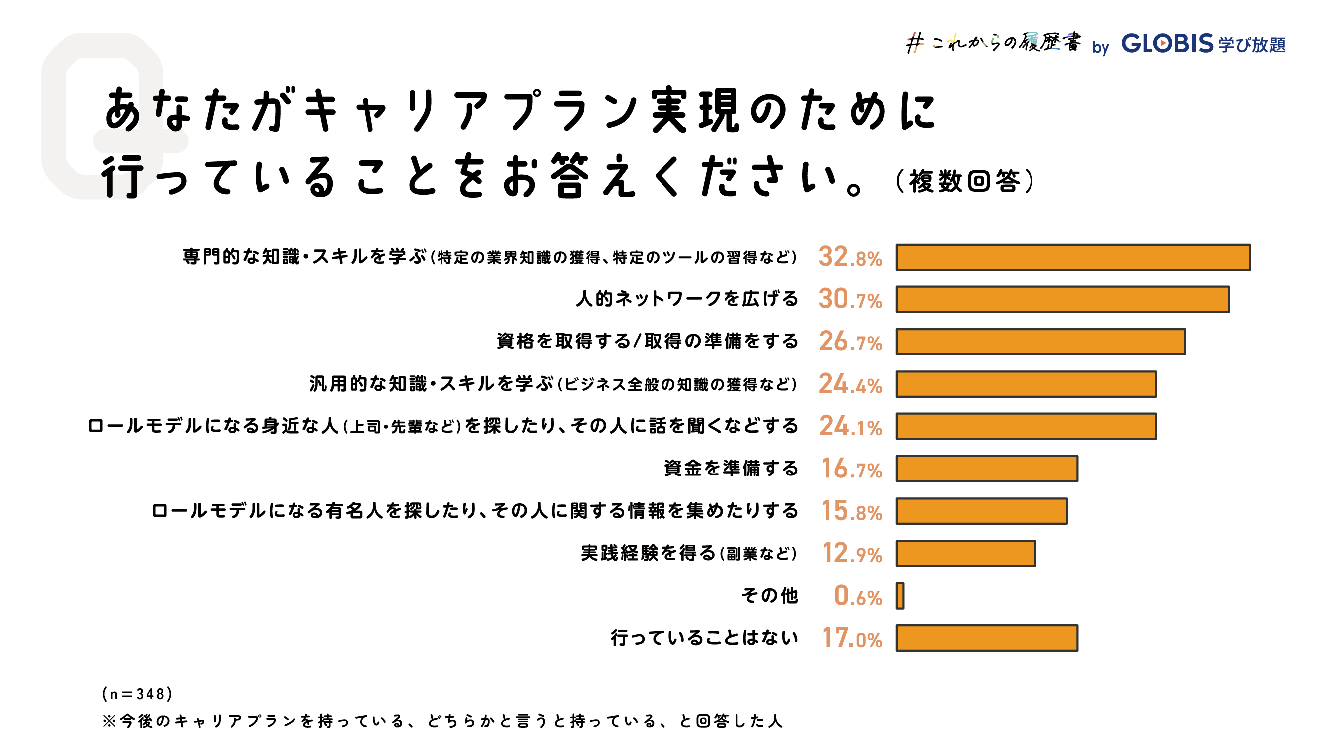 一方で、「キャリアプランを持っている」と答えた人に対し、キャリアプラン実現のためにしていることを尋ねると、「専門的な知識・スキルを学ぶ(特定の業界知識の獲得、特定ツールの習得など)」「人的ネットワークを広げる」といった回答が上位に入りました(図11)。