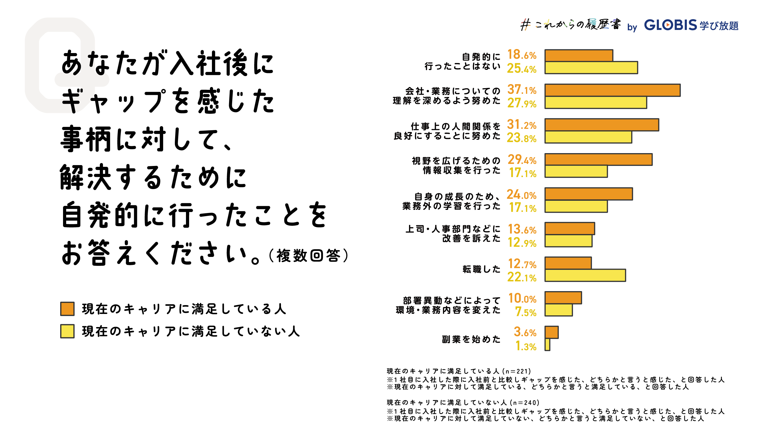 さらに、「現在のキャリアに満足している」と回答した人、「現在のキャリアに満足していない」と回答した人に対して、それぞれギャップの解消のために行ったことを尋ねたところ、「会社・業務についての理解を深めるように努めた」「仕事上の人間関係を良好にすることに努めた」「視野を広げるための情報収集を行った」などの項目が現状のキャリアに満足していると回答した人の方が上回り、自発的なアクションを取っていることが分かりました(図5)。