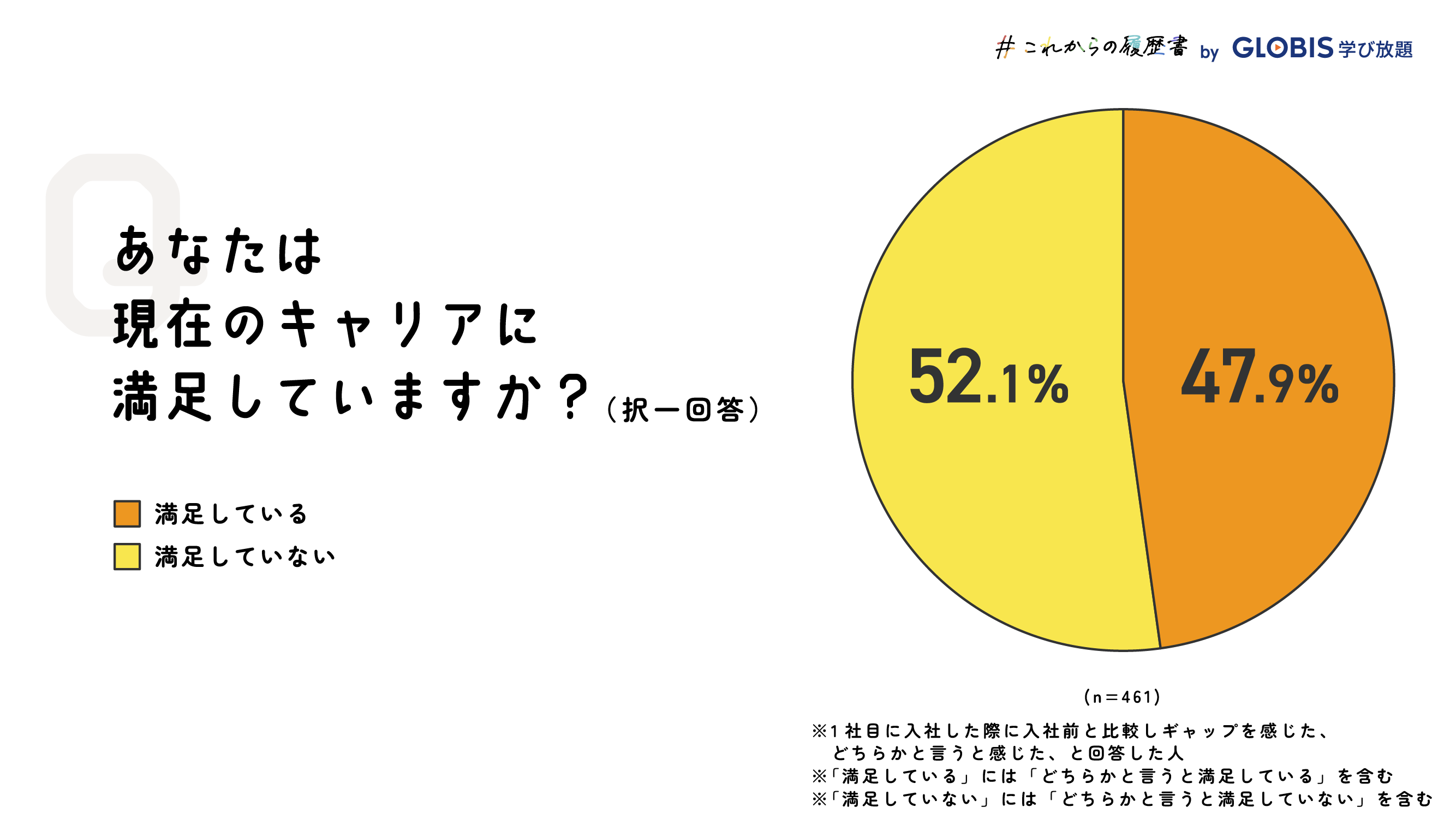 1社目で入社後ギャップを感じていた若手社会人に、現在のキャリアへの満足感を尋ねると、約半数が「満足していない」と回答しました(図4)。