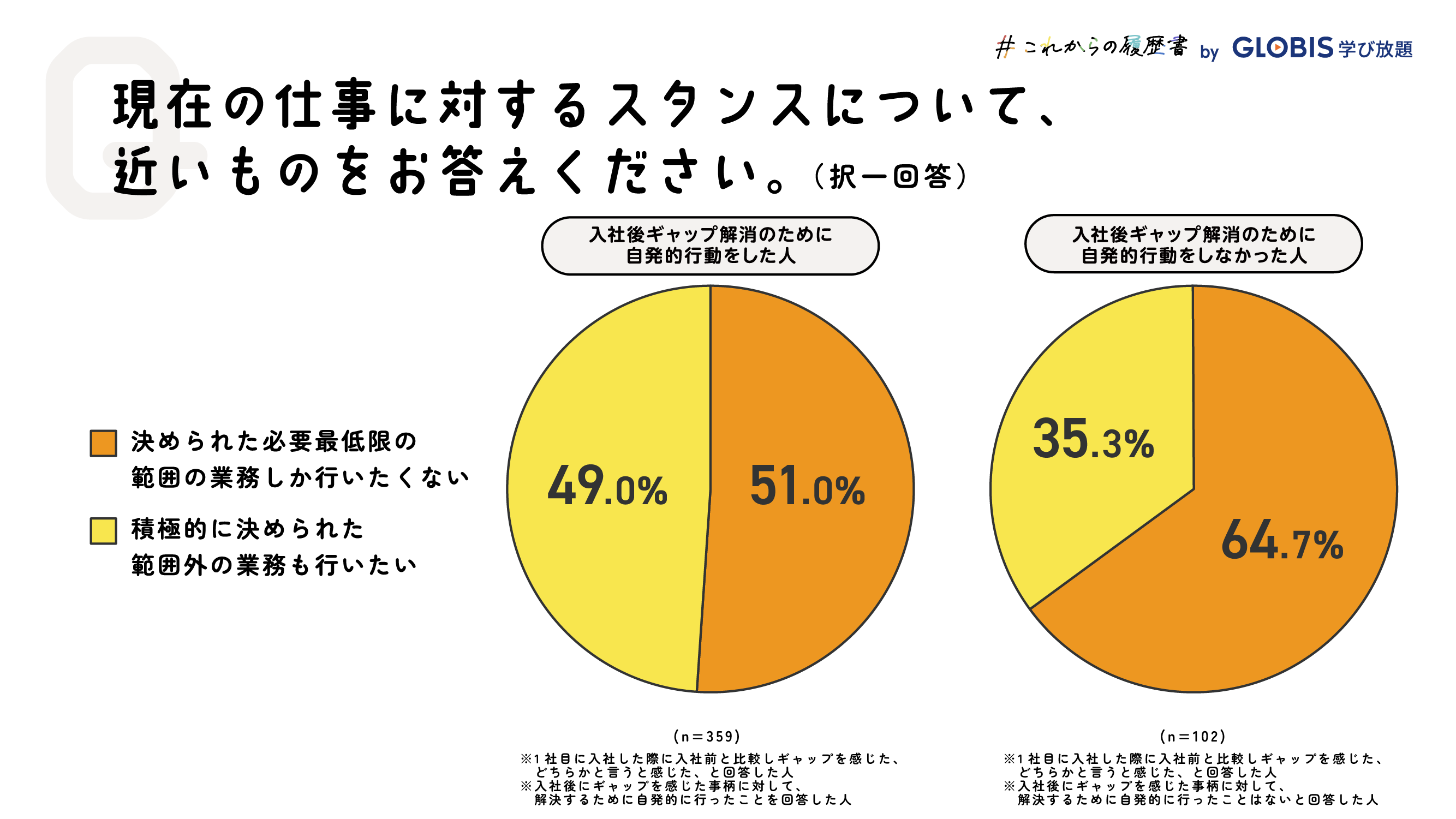 また、「現在の仕事に対するスタンスについて、近いものをお答えください」という問いに対し、約半数が「決められた必要最低限の業務しか行いたくない」と回答(図6)。さらに詳しくみると、入社後ギャップを解消するために自発的に行動をしなかった人にこの傾向が強く見られました(図7)。