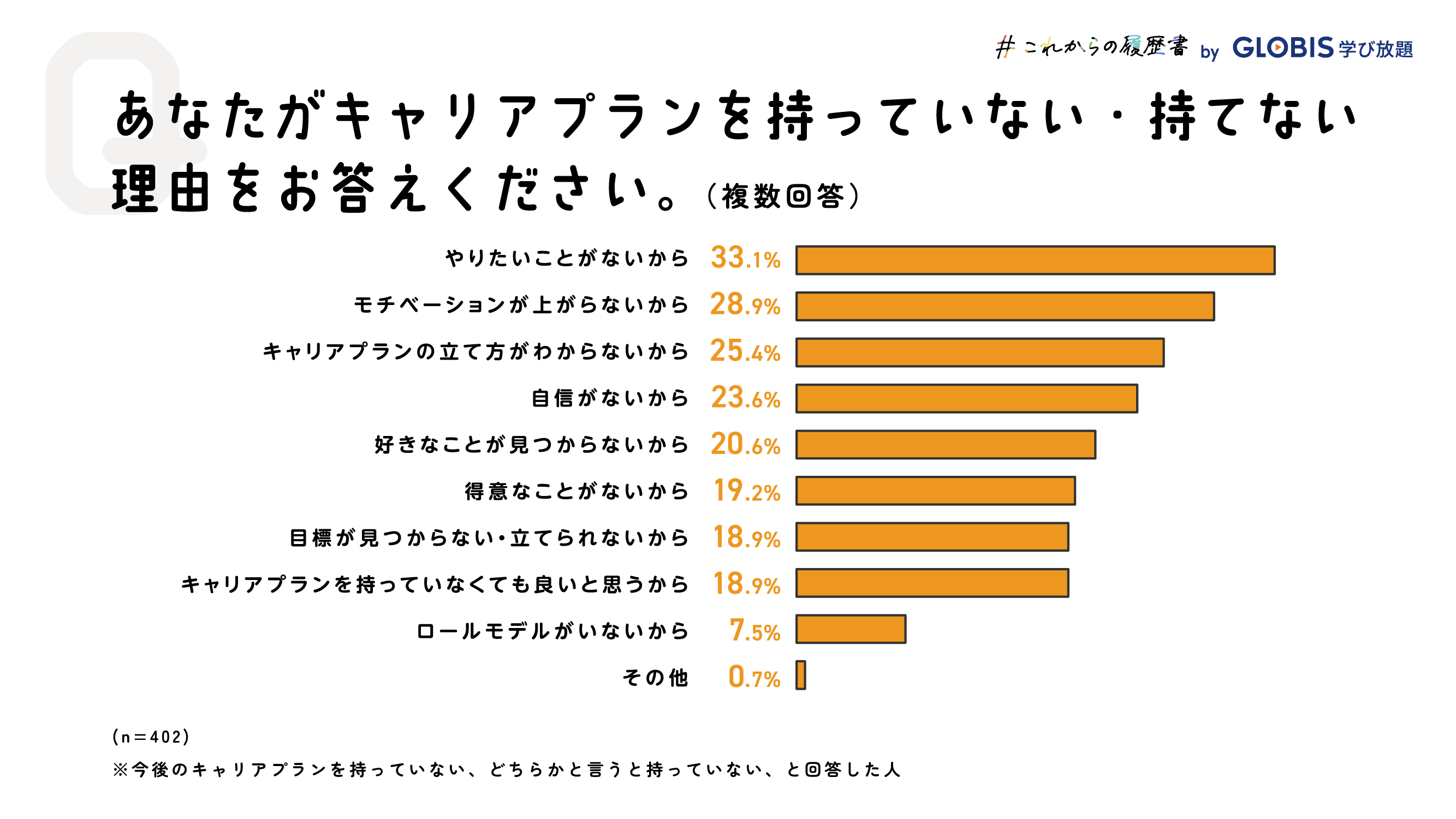 「今後のキャリアプランを持っていますか?」という問いに対し、2人に1人が「持っていない」と答えました(図8)。その理由を尋ねると、「やりたいことがないから」「モチベーションが上がらないから」といった回答が上位に入りました(図9)。
