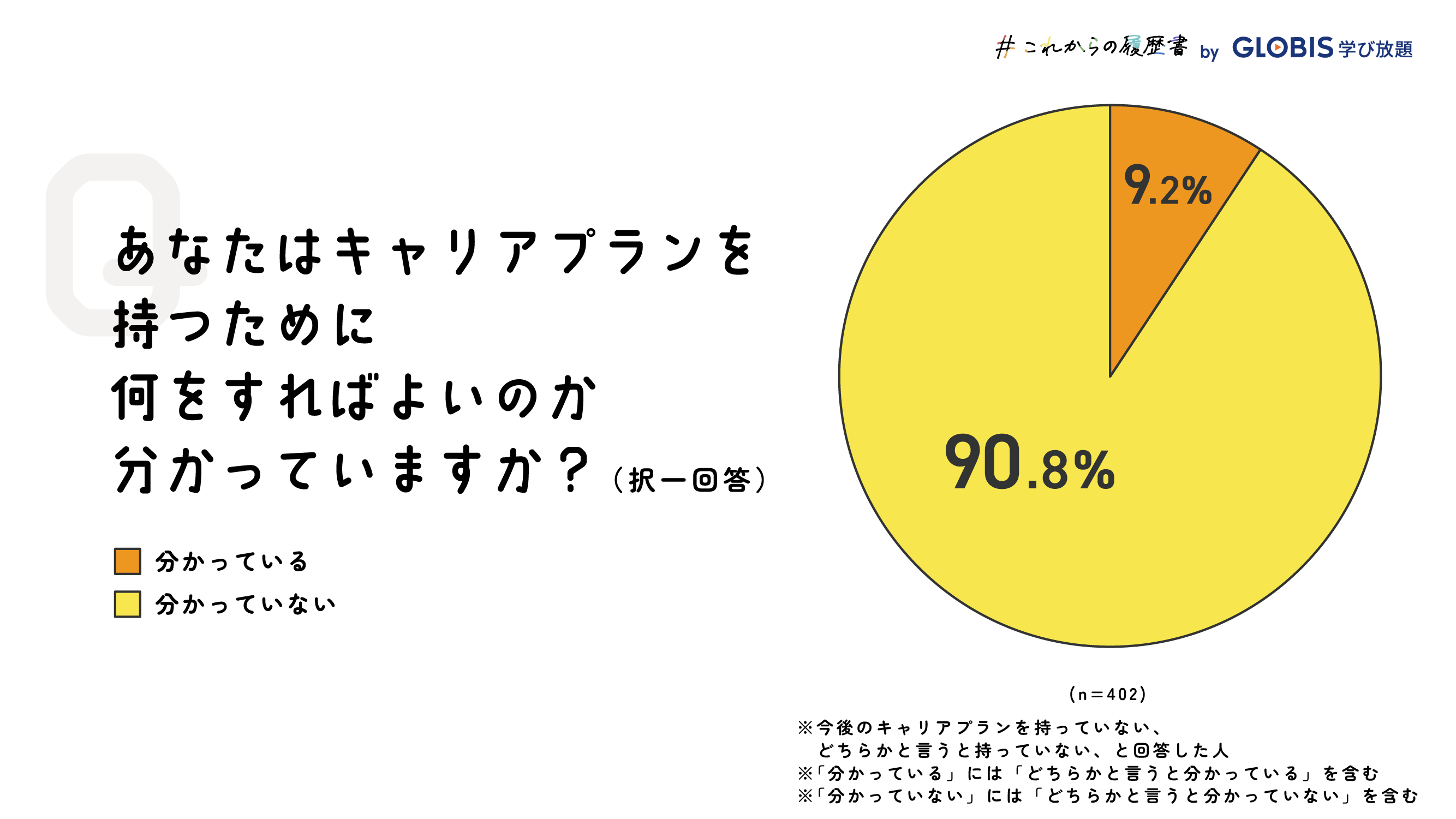 変化が激しく、未来が予測しづらい時代。GLOBIS 学び放題では、「自分らしいキャリアを描きたい」「未来に向けてどのように歩めばいいか分からない」と感じている若手ビジネスパーソンへのヒントとして、若手の学び応援企画「#これからの履歴書」を通じて情報発信しています。10月11日に発表した若手社会人の学びに関する実態調査に続き、第2弾として、キャリア観に関する調査を実施、特設サイトを用意しました。本調査では、多くの若手社会人が「今後のキャリアプランを持っていない」という実態が明らかになりました。