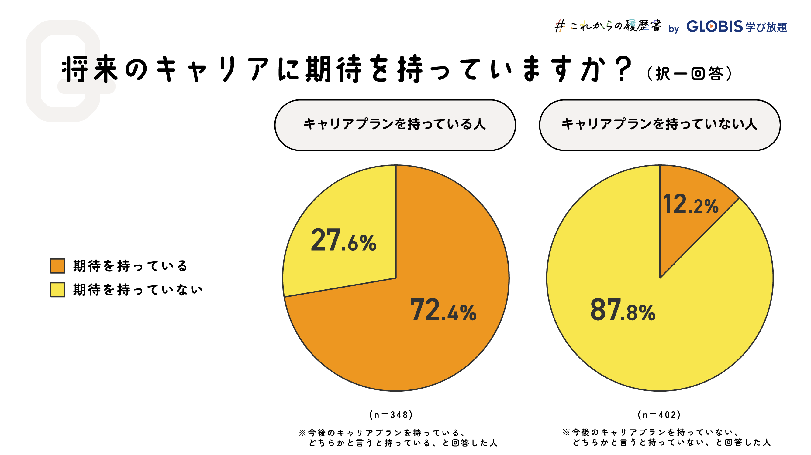 この結果を詳しく見てみると、キャリアプランを持っている人の約7割が「将来のキャリアに期待を持っている」と回答。一方、キャリアプランを持っていない人の約9割が「将来のキャリアに期待を持っていない」と答えました(図14)。