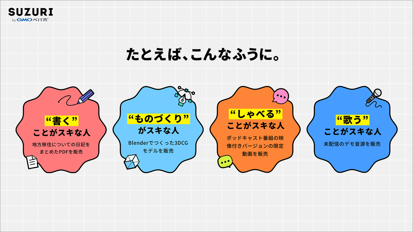 このたび「SUZURI byGMOペパボ」では、デジタルコンテンツの取り扱いを開始し、領域を拡大することで、クリエイターには新たな創作活動の場を、ユーザーに新たなコンテンツとの出会いを創出、提供いたします。