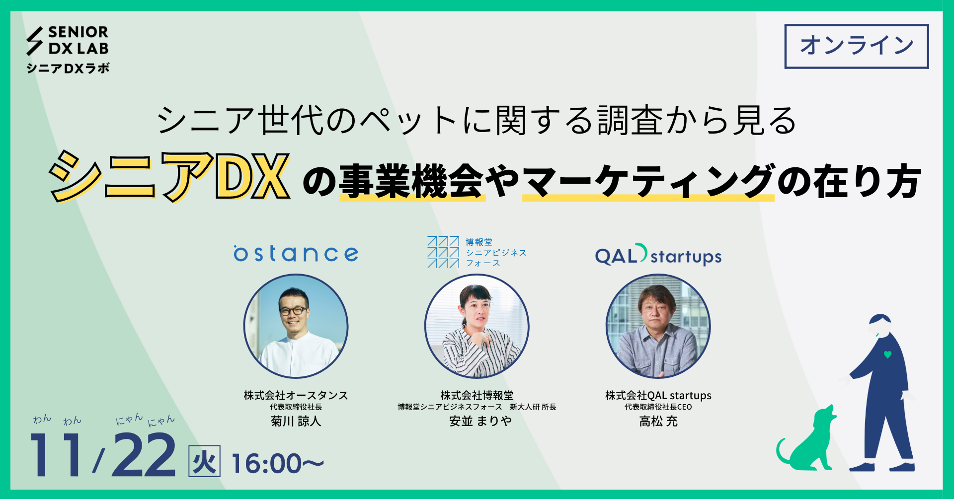 趣味人倶楽部を運営する株式会社オースタンス(本社:東京都渋谷区/代表取締役社長:菊川諒人)は、株式会社博報堂のプロジェクトチーム「博報堂シニアビジネスフォース」とQuality of Animal Lifeの向上をビジョンに掲げ、ペットとの暮らしのイノベーションを支援する「株式会社QAL startups」と「シニア世代のペットに関する調査から見る シニアDXの事業機会とマーケティングの在り方」をテーマにオンラインセミナーを、 2022年11月22日(火)16:00~17:00に共同で開催いたします。