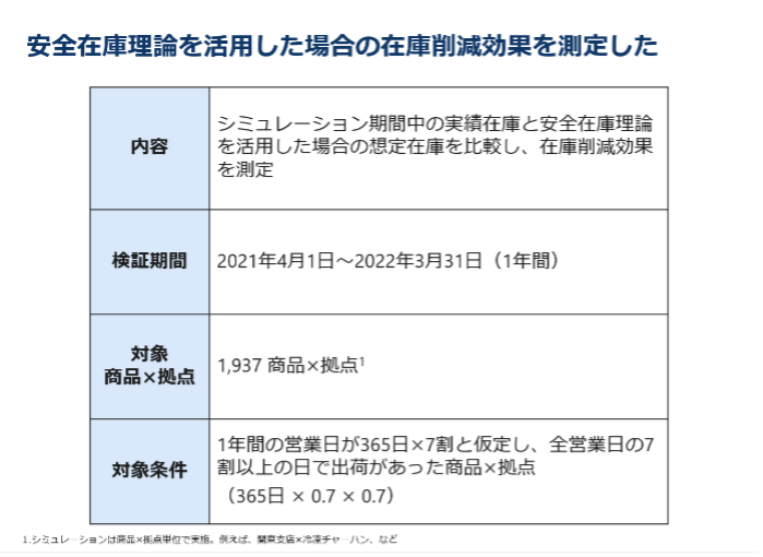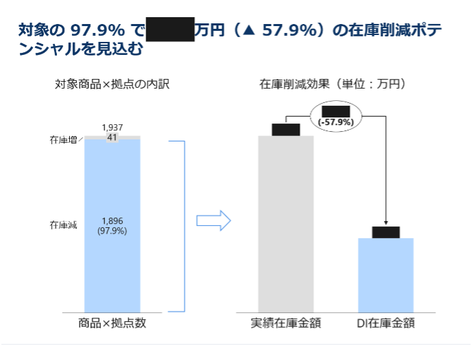 JDSCは、食品卸の株式会社さんれいフーズ(本社:鳥取県米子市、代表:並河 元)に「JDSC 過剰在庫・欠品削減シミュレーション」を事前提供し、対象品目※の97.9%で57.9%の在庫削減ポテンシャルを確認しました。